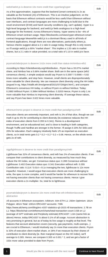 There is also debate about whether to only ask humans to choose which repo is more impactful, but get rid of the quantifier asking how much more impactful it is. A pilot with jury simply picking the more impactful repo would be good to try; in the present iteration, we decided to keep the multiplier to prevent peanut butter spreads and giving an advantage to those who split projects into multiple repos (egalitarian bias).