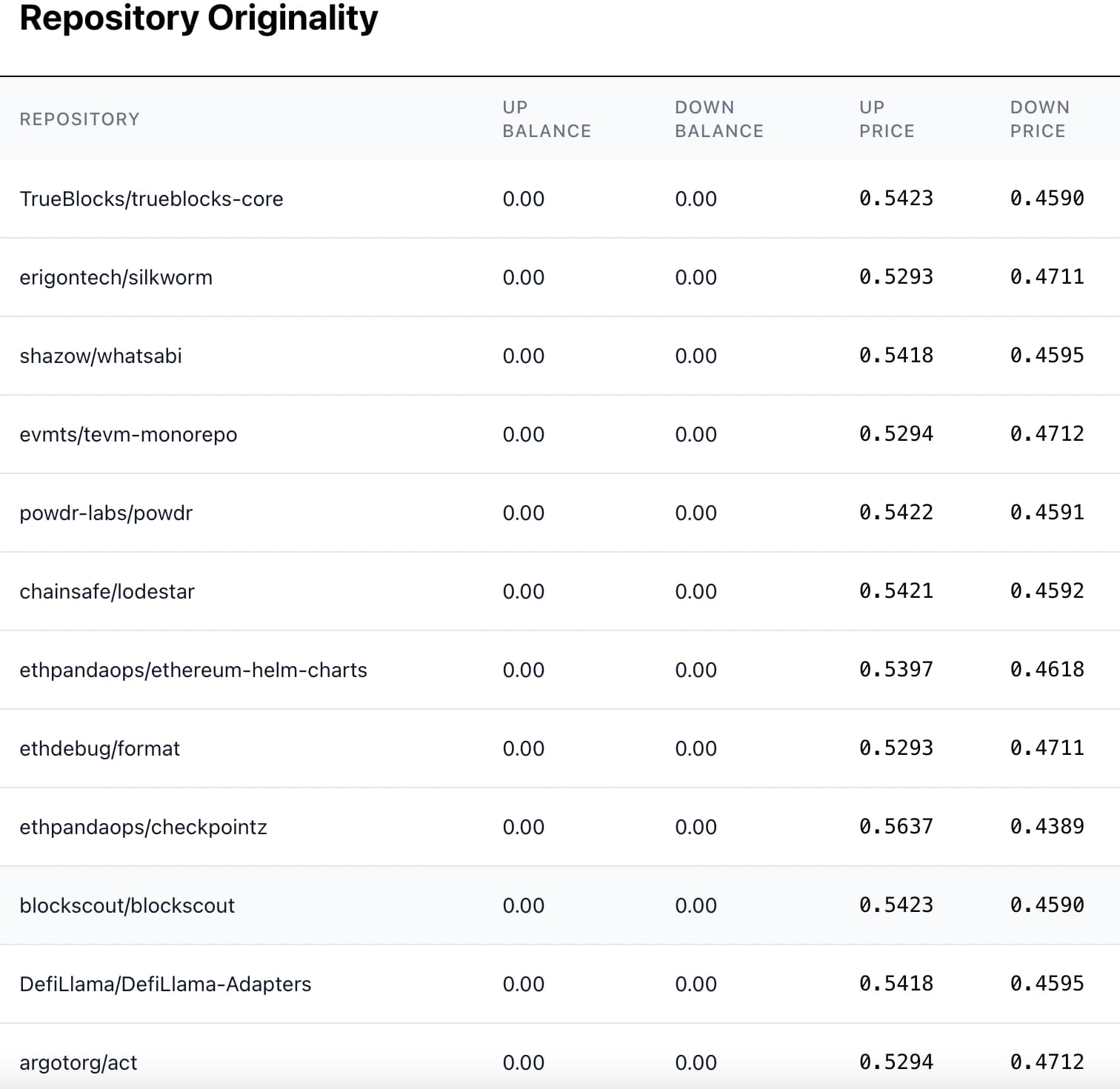 Assessing originality is conducted via a simple scalar prediction market. Model builders place trades by either purchasing a seed nodes “UP” token implying a belief that it is more original than the market is assessing it at, or a “DOWN” token implying that its child nodes or dependencies deserve a greater share of credit than it is currently being assessed at. Together, UP and DOWN for each repo sum to ~1.