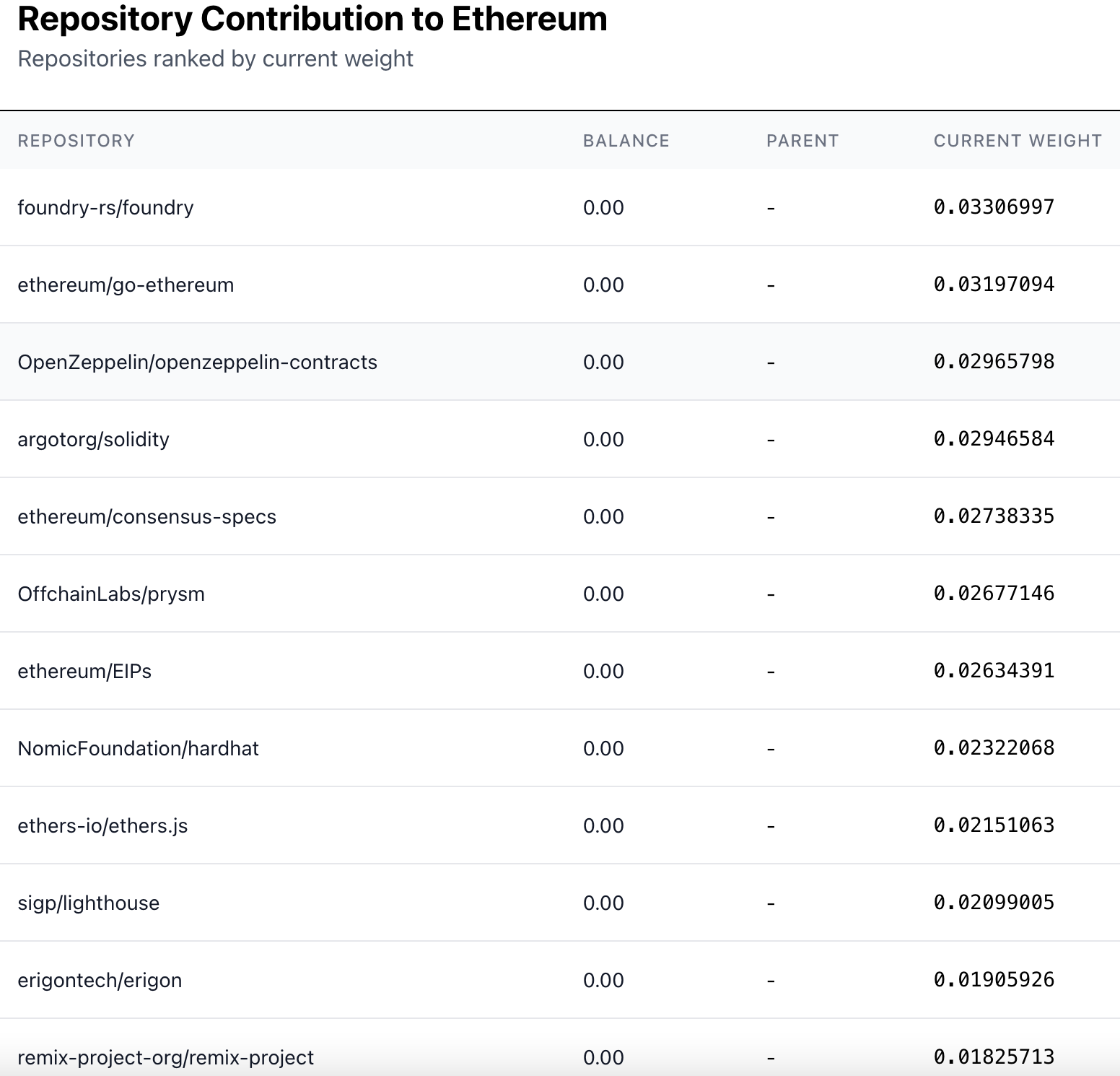 A new list of 201 open source repos, accessible here, were procured through an open call for applications wherein projects participating in the GG24 Quadratic Funding round could also share their repo for consideration in the deep funding round. Round operators also asked experts in the ecosystem on which repos matter to Ethereum and manually added them to the list.
